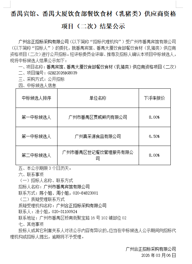 番禺宾馆、番禺大厦饮食部餐饮食材(乳猪类)供应商资格项目(二次)结果公示