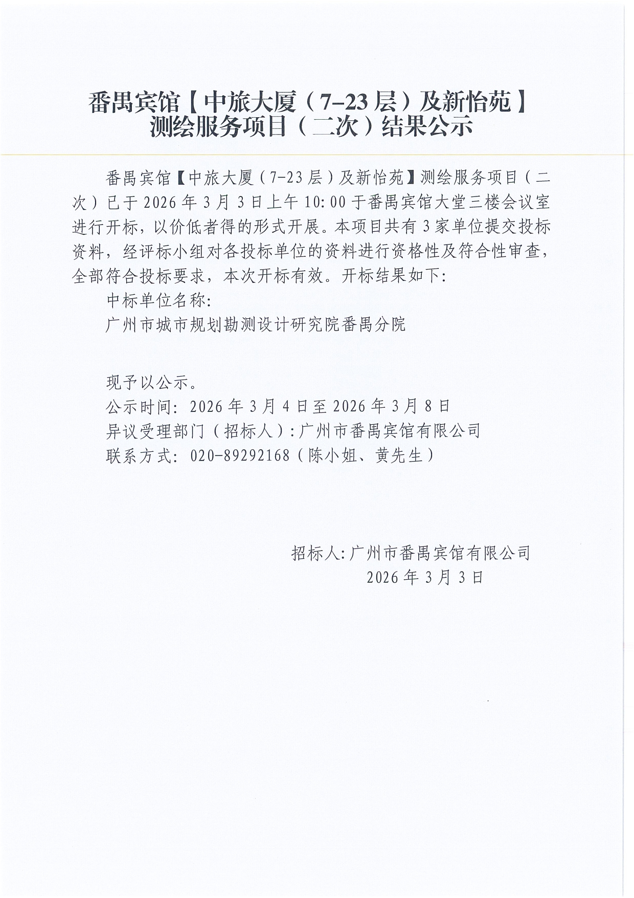 番禺宾馆【中旅大厦(7-23层)及新怡苑】测绘服务项目(二次)结果公示