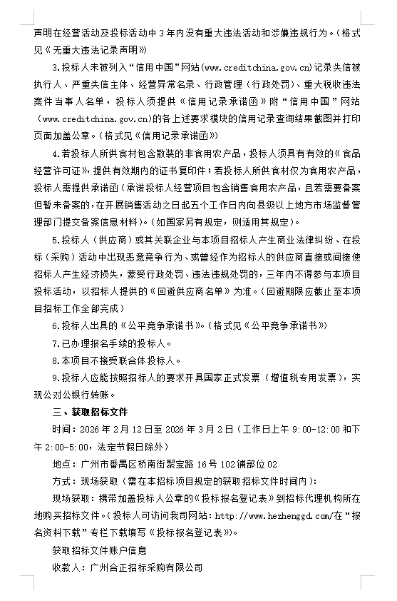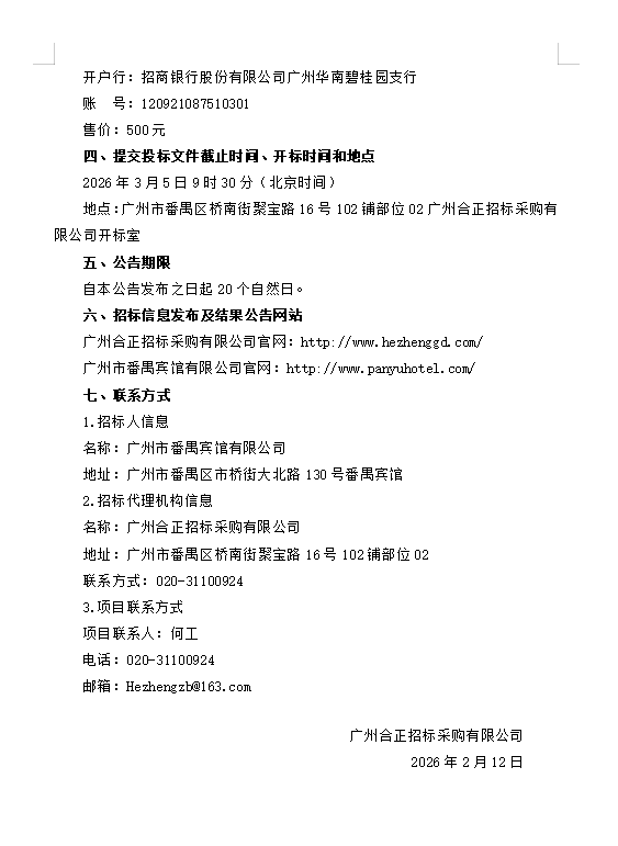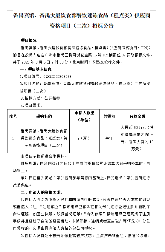 番禺宾馆、番禺大厦饮食部餐饮速冻食品(糕点类)供应商资格项目(二次)招标公告