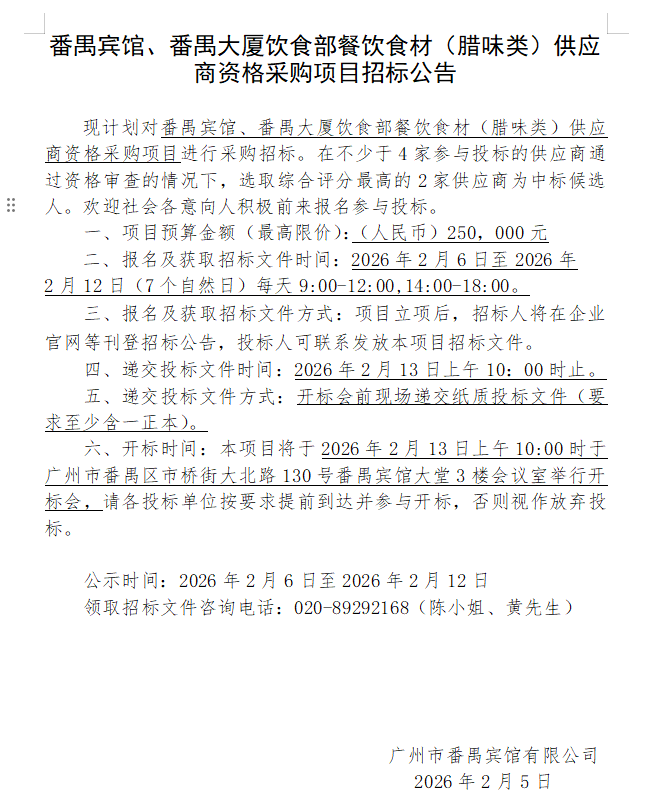 番禺宾馆、番禺大厦饮食部餐饮食材(腊味类)供应商资格采购项目招标公告