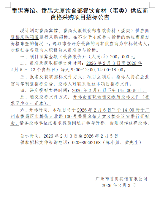 番禺宾馆、番禺大厦饮食部餐饮食材(蛋类)供应商资格采购项目招标公告