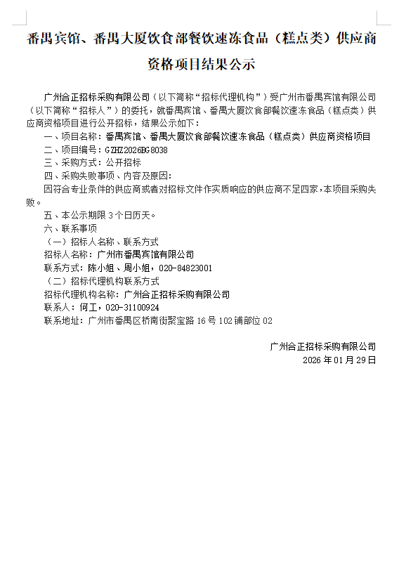 番禺宾馆、番禺大厦饮食部餐饮食材(糕点类)供应商资格项目结果公示