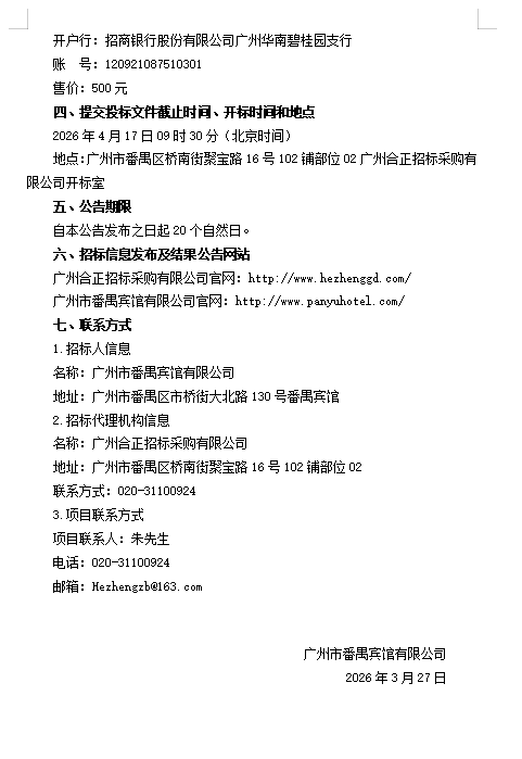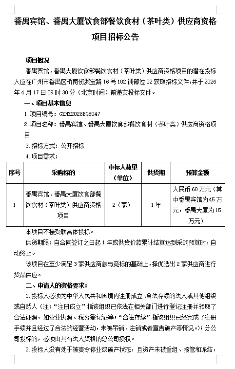 番禺宾馆、番禺大厦饮食部餐饮食材(茶叶类)供应商资格项目招标公告